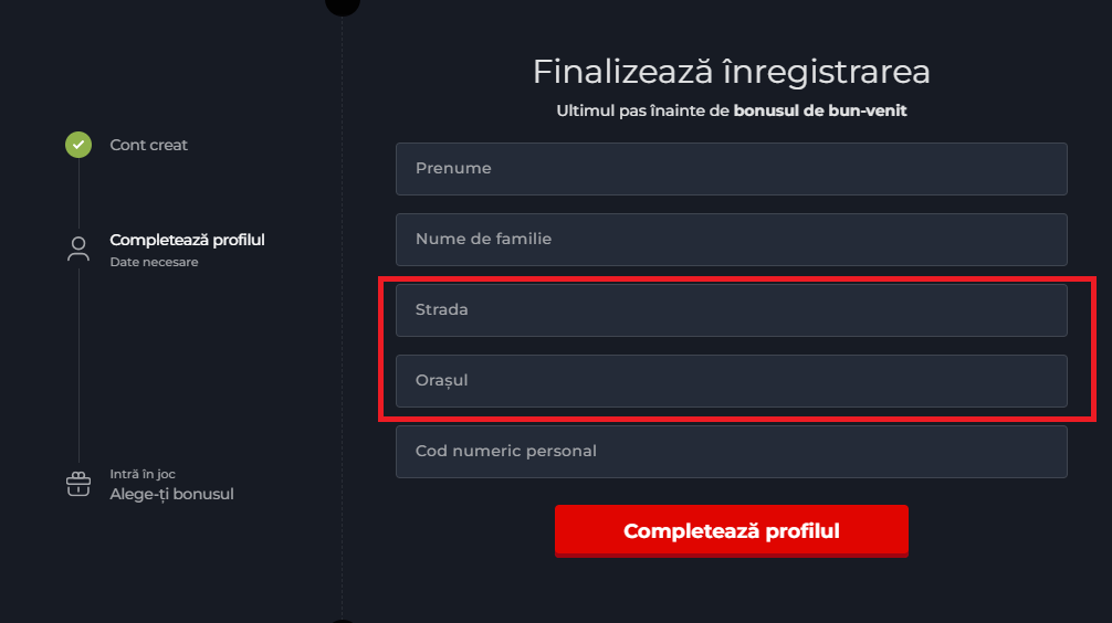 Un pas important în procesul de înregistrare este completarea adresei de domiciliu. În cea de-a doua etapă a procesului de înregistrare, te rugăm să completezi Strada și Orașul exact cum sunt înscrise în cartea ta de identitate.