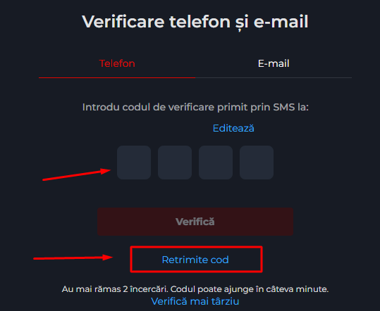 Codul poate ajunge în câteva minute. În cazul în care nu a ajuns, apasă “Retrimite”.