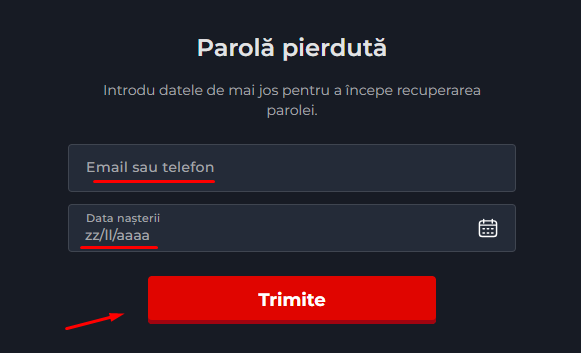 Introdu adresa de e-mail și data nașterii și apasă butonul "Trimite".
