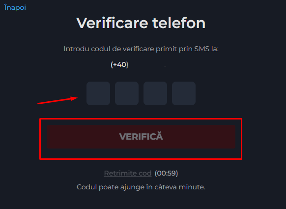 Codul poate ajunge în câteva minute. În cazul în care nu a ajuns, apasă “Retrimite”.