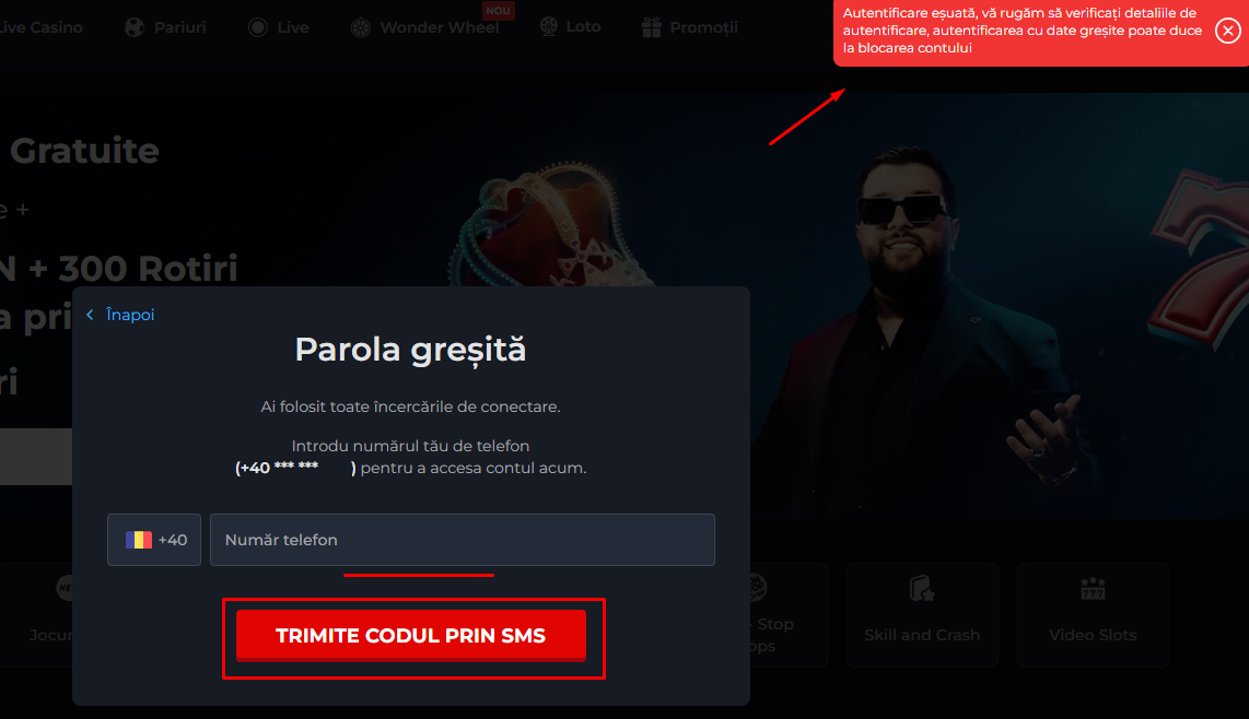 - Introdu numărul de telefon și apasă butonul “Trimite cod prin SMS"