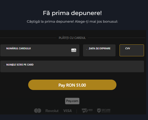 Introdu cu atenție datele cardului și apasă butonul "Depune RON xx.xx" (se va afișa și suma pe care o vei plăti cu cardul).