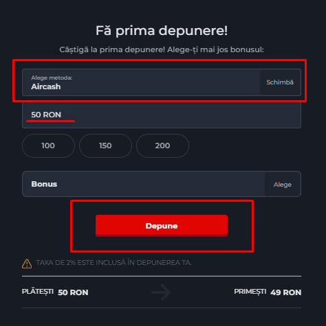 - Selectează "Aircash" pentru metoda de depunere
